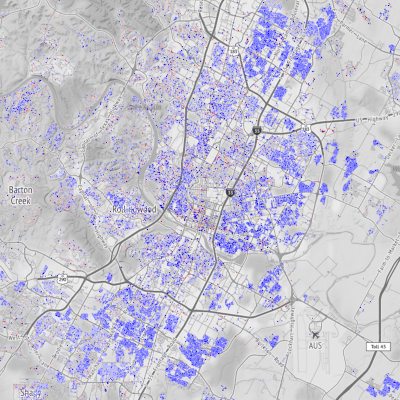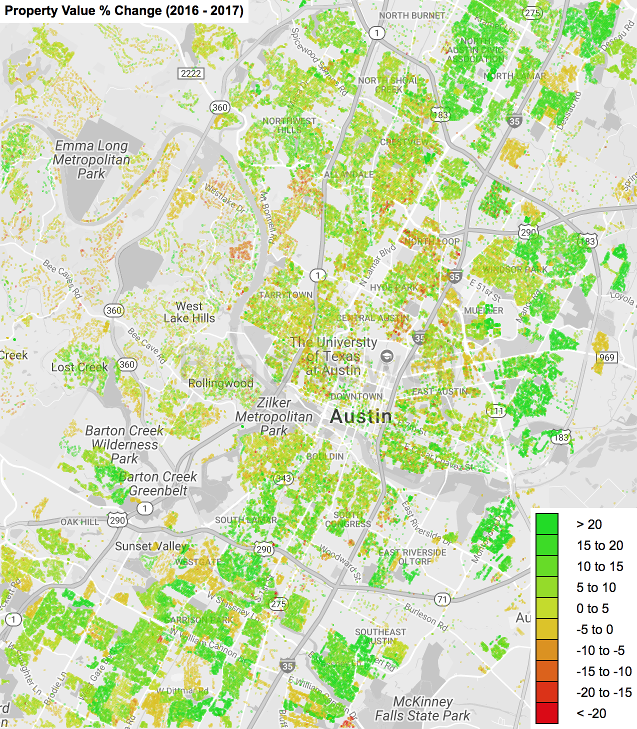 A visualization of the change in property values for Austin, TX from 2016 to 2017.…